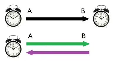 This would seem intuitively easy given that we can do this for cars travelling between cities or sprinters on a racetrack. However, to fully take into account the relativistic effects and measure the speed of light with reliability, a convention must be introduced to determine how to synchronise the clocks. Naively, one could say that you would synchronize your clocks at point A, then walk one clock over to point B. You stop clock A when you fire off the photon and stop clock B when the photon hits. You carry clock B back to clock A and compare the two times (or send a message some other way), and this then gives you the one-way velocity of light.