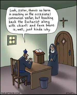 This Eucharist, also known as a communion wafer or "the Host", is either a frackin' cracker,[5] a symbolic (or not so symbolic) piece of the Body of Christ,[6] or a worse threat of breast cancer than abortions!!![7]