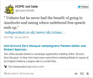 - Laura Stuart. "Hope not Hate Reveals – Islamophobia" deliberation.info. Archived 13 February 2012 by the Wayback Machine).