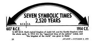 Because of an alleged prophecy in Daniel 4, the original JW believed that Jesus began to rule in 607 BCE, that there will be Seven Times after 607 BCE until a certain generation is born, that Armageddon will begin before that generation passes away, that these Seven Times are Symbolic Times and actually mean 360 years each (for a total of 2520 years), and that therefore the generation which observed the "events of 1914" (the start of WW1) will also see the Armageddon. Given that this is no longer possible,[2] JW teachings have shifted to the overlapping generation idea.[3]
