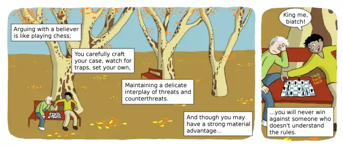 Andrew Schlafly was similarly described for his contributions to Usenet talk.origins in 2002:[4] "I tried it for a while, but arguing with Andy is like playing chess with a small child who doesn't know the rules."