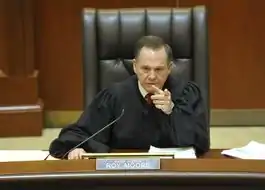 Roy Stewart Moore (1947–) is the former chief justice of the Alabama Supreme Court, former contributor for WorldNetDaily, and failed candidate for the United States Senate. Having twice lost his job as chief justice of the court,[2] he denies evolution, is a raging homophobe, Islamophobe, and serial violator of judicial ethics rules, and has said the events of September 11 were God's punishment for America's acceptance of gay rights and abortion.[3] A ghastly campaign for the Senate in 2017 revealed more details of Moore's personal seaminess, and he narrowly(!) lost the election to Democratic candidate Doug Jones.