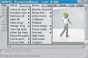 The vast majority of TIs consider themselves to be victims of inchoate, ongoing and relentless "touchless torture" plots. The nature of these alleged "attacks" varies among TIs but generally involves some combination of asinine drama with pseudoscientific flummery and/or improbable, coordinated malicious actions. This all includes: remote neural monitoring,[6] microwaves,[7] "psychotronics"[8] (basically a variety of hypothetical electronic [9] weaponry[10]), secret mind control,[11] actively enforced "gangstalking",[12] "remote sexual abuse",[13] surgical insertion of alien implants,[Note 2][14] HAARP harassment[15] and even reptilian involvement.[Note 3][14]