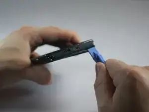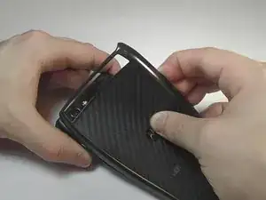 Insert the plastic opening tool between the back cover and the front piece of the case, freeing the plastic clips between the phone.
