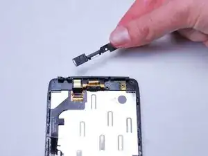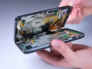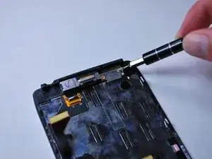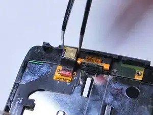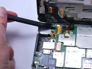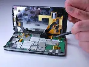 Release the two black ribbon flex cables by gently pulling up on the connection using the spudger. Then lift the screen to remove.