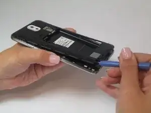 Setze ein Plastiköffnungswerkzeug in den Spalt zwischen Rückgehäuse und dem Rest des Smartphones.