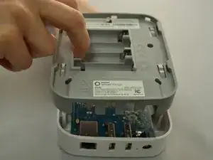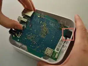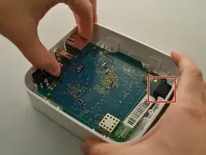 To remove the motherboard, grip the USB port and the Ethernet port. Lift up, then slide towards the front of the device to release the motherboard from the black retaining clip shown on the right.