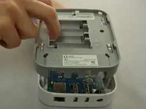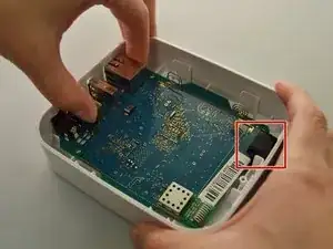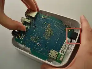 To remove the motherboard, grip the USB port and the Ethernet port. Lift up, then slide towards the front of the device to release the motherboard from the black retaining clip shown on the right.