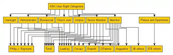 The hierarchy at aSK was never well established, but if the user rights groups are anything to go by, it was intended to be almost as tightly managed as RationalWikiWiki.[3]