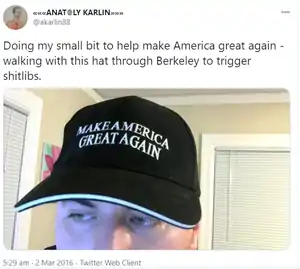 Karlin supported Trump in the 2016 and 2020 presidential elections.[60][61] In 2016 he walked around UC Berkeley with a MAGA hat.[62] In 2020 Karlin endorsed Trump on the basis he opposes "SJWism".[63]