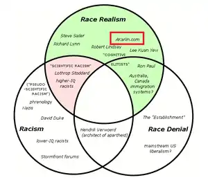Despite holding standard white nationalist and alt-right political views, Karlin tries to distinguish himself to make him feel special by identifying as a "racial realist" opposed to a "racist". This laughably is seen in a drawing he made where he classifies himself alongside Richard Lynn and Steve Sailer, not the Nazi knuckle-draggers and boneheads from Stormfront.[68]
