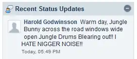 "Im afraid i've already admitted i'm a profesed Racist," says "Teutoburg Weald". "And if your a Darkie, Libral/Lovvie-Lefty fucking Bum Tart, then in this day and age yer the most Fashionable, sheek, perfumed rag-head Bastard on the face of this fucking shit hole of a planet, and being a Muzzie, your twice the most Fashionable, Sheek, Perfumed rag-head Camel Humping Bum-Tart Bastard on the face of this fucking shit hole of a Planet." He then added that "I'm a Racist, Homaphobic, none Sycophantic and completely un-PC Ethnic Engliscman and do you know what? I FUCKING LOVE IT!!!!!!!"