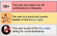 It's true that the individual who deleted the ad for English Shieldwall did, at the time, have an infobox in his profile identifying himself as "part of the Goy cabal aiming for world-dominance".[49] However, what Youngy failed to realise is that, like many other infoboxes made for Wikipedia profiles, this is a joke. A "goy", of course, is a non-Jew; the idea of a "goy cabal" is an obvious parody of antisemitic conspiracy theories regarding Jewish cabals. And members of a secret society plotting world domination would be unlikely to announce their intentions in their flippin' Wikipedia profiles, would they, Youngy? (The "cabal" reference itself is a Wikipedia in-joke, referring to the "there's no cabal"