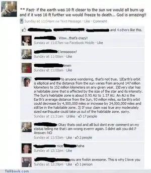 Another example: standard acceleration on the surface of his cosmic lunatic asylum masterpiece (Earth) is 9.8m/s.[2] Not 10, which is a more "beautiful" value. So much for fine tuning.[note 1]