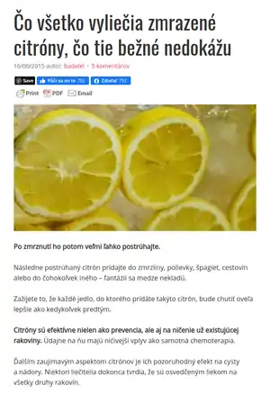 “”[Zmrazené] citróny sú efektívne nielen ako prevencia, ale aj na ničenie už existujúcej rakoviny. Údajne na ňu majú ničivejší vplyv ako samotná chemoterapia. ... Niektorí liečitelia dokonca tvrdia, že sú osvedčeným liekom na všetky druhy rakovín. |