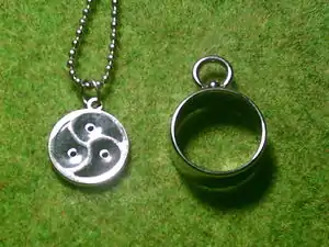 The triskelion, used in many English speaking countries, needs to be of quite specific design to be recognised as a BDSM symbol, with the outer circle and spokes needing to be of a metallic colour (gold, silver, steel or iron are the most common), the background needs to be a solid colour and the three holes need to be holes, not dots, and are usually edged in the same metal as the circle and spokes. The greasy thumbprint over the whole thing is entirely optional. However, variations of the BDSM symbol do occur where the triskelion is represented by flowers, normally red roses, that have prominent thorns shown as part of the symbol.
