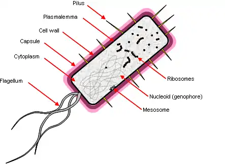 A bacterium (pl. bacteria) is a single-celled organism lacking the more complex organelles such as mitochondria and chloroplasts, which are themselves thought to be symbiotic bacteria (see endosymbiosis). They reproduce by binary fission and share genes through transfer of plasmids, small ring-shaped chains of DNA.