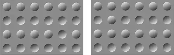 The shift in concavity relies on a prior assumption that the light source comes from above. This is a perfectly sane and rational prior to build into the sensory system and would work under most conditions. But when there is actually no light source, and the difference in shades of color is real, the Bayesian mind winds up with the "wrong" hypothesis and hence the illusion. The "light from above" prior is one of the more specific Bayesian priors for optical illusions.