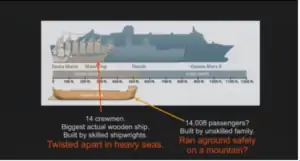 Later on, Nye continues to question a literal interpretation of the Noah's Ark story. He provides a chart of relative boat sizes, where the theoretical size of the Ark dwarfs that of the largest wooden boat ever constructed. "People in the 1900s built an extraordinarily large wooden ship, the Wyoming.
