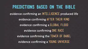 One challenge often leveled at creationists is that their beliefs do not make predictions as scientific theories do[18]. Ham saw to it that he countered this assumption by making a set of anecdotal predictions based on a literal interpretation of the Bible. Even after a small level of scrutiny, all of the predictions are either scientifically incorrect or are too loose of a definition to accurately define and falsify (as in the case of evidence confirming one race).
