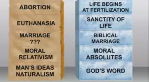 Another fallacy Ham falls into is the argument from adverse consequences. He argues that this is a "battle of philosophical worldviews" and presents the slippery slope argument that believing in naturalistic evolution leads to moral relativism, then to same-sex marriage and the decline of the sanctity of marriage, then to euthanasia and "getting rid of old people", then finally to abortion.