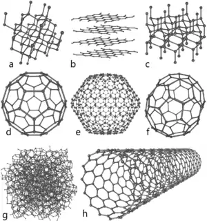 Pure carbon forms several different compounds in different ways. Diamond is a three dimensional lattice that due to its stable bonds is very hard. Very, very hard. And pretty when cut well. Graphite forms 2-dimensional sheets that are very loosely bonded to each other, making it very slippery. Synthetic buckyballs are geodesic domes formed of 60 carbon atoms; buckytubes are similar but form long hollow fibers.