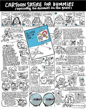 Other writers have pointed out that using drowned Syrian children and raped Nigerian schoolgirls is still using marginalized people as ambiguous props which only emboldens racists and might belie the unconscious racism at worst and indifference at best held by the cartoonists themselves.[14] But the critique of using marginalized people as ambiguous props is not unique to Charlie Hebdo, as it is a common tactic by many political cartoonists to get a succinct point across. Nathaniel Tapley, a writer for BBC's "Have I Got News for You", has turned that critique and the outrage on their heads by pretending to be outraged of similar cartoons by others in the Anglo world.[12]