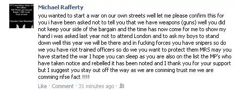One of Rafferty's online comments, involving firearms being brought to London, resulted in more than 170 EDL supporters being arrested in November 2011 to prevent a breach of the peace.[5]
