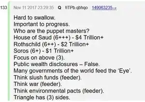 The knowledge suppression aspect (for example, free energy suppression) plays nicely into our thinking about the abhorrence of censorship and the want to do something good in the world. Meanwhile, the "Them" aspect plays nicely into the distrust and hatred people hold for corporations, governments or any other entity that exists in the abstract, rather than personal. It's easy to demonise an organisation, but it's much harder to demonise a person. When a skeptic wanders into a conspiracy forum, the ad hominem responses of conspiracy advocates tend to be of the type: "you work for the Illuminati", "you're paid by Big Oil", "you're a NASA shill", or one of countless other accusations. It's never "you are the Illuminati" or "you work for David Smales, who lives at 45 9th Avenue with a wife and two children and another on the way, who plays golf on the weekend, likes his pet dog and just happens to be the head of Big Oil". No, They are faceless and easy targets. Even in the circumstances when conspiracy theorists are capable of pointing the finger at a person they can identify outright — such as the pilot in charge of the AC-130 flying over Washington DC during the 9/11 attacks who is accused of dropping wreckage to "fake" the attack on the Pentagon — charges are always accompanied by phrases like "perhaps he didn't know what he was doing or perhaps he was following orders and wasn't aware". However, this does not apply to conspiracy theories driven by bigotry, such as racist, homophobic or antisemitic conspiracy theories.