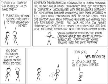 "Most conspiracy theories don't make sense nor withstand any scrutiny. They usually involve operations so immense that it's basically impossible for them to be kept secret, and all the proof given by conspiracy theorists usually have a very simple explanation (usually much simpler than the explanation given by the theorists)."[12]