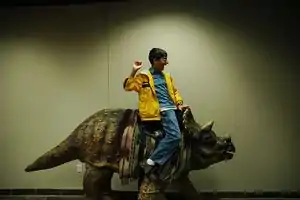Dinosaurs (of the non-bird variety) are common in the Creation Museum: after all, the kiddies love 'em, and they are therefore a depressingly effective tool for indoctrination. The Creation Museum contains numerous displays of dinosaurs coexisting peacefully with humans[16] despite the overwhelming evidence that MOST dinosaurs died out millions of years before the first humans,[17] and in case that discrepancy comes up the place also has an exhibit showing a wrecking ball labeled "MILLIONS OF YEARS" striking the foundation of a church to reinforce the false dilemma that one must believe either all the Bible (except of course those parts the fundamentalists choose to ignore) or none of it at all. The Creation Museum supports the view that all dinosaurs in the Garden of Eden were herbivores,[18] and when asked why T. rex had six-inch-long serrated teeth the guide will explain that those were for opening coconuts.[19]