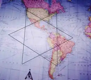 Contributor Pastor Ron Riffe went on to suggest that they two lines were actually part of a hexagram, and dutifully plotted out such a shape on a map of the world. Disasters which occurred on or around the lines of this hexagram include the Venezuela floods, the Waco incident, the murder of Jonbenet Ramsey and the crashing of John F. Kennedy Jr's plane ("While his plane apparently did not go down right on the line, it went down close enough to it to raise one's eyebrows"). At the centre of the hexagram are the Galapagos Islands, "at which Darwin conceived his Satanic idea we now call Evolution".