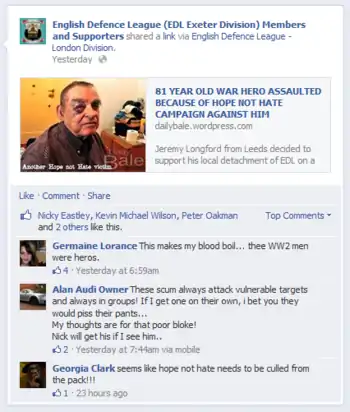 One lie from Bale which had repercussions involved the Globe pub in Leicester. Bale ran a faked story claiming that the Globe was barring any British army personnel so as not to offend immigrant customers; the story was linked to by an admin at the official English Defence League Facebook page, before being removed and subsequently reposted by a different admin. The staff of the pub were reportedly treated with aggression and abusive phone calls from people who believed Bale's lie, and the Globe even had to close down temporarily. The EDL admin later deleted the link and apologised to the Globe.[23][24][25]