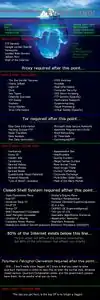 | So that damned iceberg is still in the graphic, so I guess we'll name this level after it. For some reason FTP servers are placed below MySQL databases. Of course, the more edgy content like 4chan and Jailbait is listed. Made up terms like 'Google Locked Results' (presumably officially censored results that come with Lumen links), and pirate streaming service 'Let me Watch This' are placed next to honeypots. |