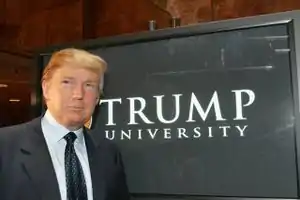 Trump University was essentially a diploma mill, a scam in which people were promised an education in real estate by hand-picked experts in exchange for exorbitant "tuition". Salesmen were told to apply high-pressure tactics on vulnerable people. Some were encouraged to max out their credit cards, others had to cough up their disability money, etc.[124] In return, they received bare-bones real estate education from people Trump never even met, though he was very much involved in the marketing aspects.[125] He got a cut in return for these "institutions" being allowed to use his name.[126]
