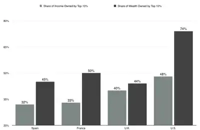 Indeed, in some nations, wealth inequality is much higher than the nation's income inequality suggests. The United States, for example, already has a highly unequal distribution of income: the top 10% earn 48% of the nation's income. But the top 10% control a staggering 74% of the nation's wealth.[9]