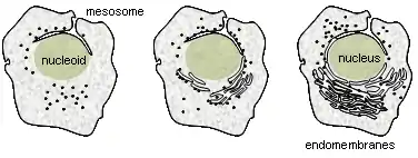 The most characteristic feature of a eukaryotic cell, the nucleus, consists of a nucleoplasm surrounded by a double nuclear membrane pierced by nuclear pores.[1][2] The nucleoplasm contains the (linear) chromosomes of the cell, which are organised into heterochromatin, which stains only a little, and euchromatin, which stains more densely. The most important euchromatic area is the nucleolus, in which ribosomes are formed. The name derives from εύ-καρυον (eu-karyon)—true kernel, or the nucleus.