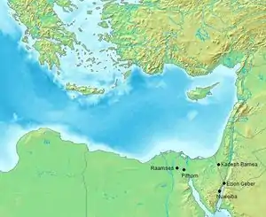 The Book of Numbers gives a list of sites at which the Hebrews allegedly settled, in Sinai and its immediate surroundings, during the Exodus. Of these sites, a select few can be pinpointed relatively well by description and deduction. Two such sites are the Biblical Kadesh Barnea, modern Ein Qadis, and Ezion Geber, on the Israeli side of the border between Israel and Jordan, just outside Eilat. Both sites have been investigated archaeologically, and found to have been founded during the Ancient Near Eastern Late Iron Age — no earlier than 700/800 BCE,[21] with the obvious exception of early neolithic/nomadic activity.