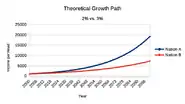 The miracle of compounding returns. 2% growth vs 3% over 100 years.