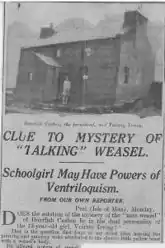 There's some indication the tale originated when 13 year-old Voirrey Irving, an accomplished rabbit hunter, began saying that dead rabbits she brought home were killed by her friend, a sentient mongoose, and before long she had her parents believing the tale and spreading it to their neighbors.[2] Other accounts speculate that the precocious Voirrey told school chums of her chatty little pal, no doubt inspired by Rikki-Tikki-Tavi, a short story by Rudyard Kipling about the adventures of a spunky young mongoose adopted into a British family. The local kids quickly found entertainment in taunting Voirrey and vandalizing the Irvings' farmhouse. Rural correspondents reported these disturbances and the bizarre story behind them to Isle of Man newspapers like the Weekly Times and Examiner, who were soon claiming an "exclusive" on the story.[3]