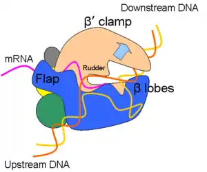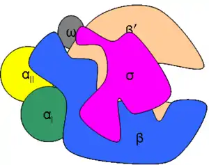 Bacterial RNA polymerases are composed of multiple subunits. The core enzyme consists of 2 α, β and β′ subunits. This enzyme contains the catalytic activity for RNA synthesis. Association of the core enzyme with the σ subunit is required for initiation of transcription. This complex is referred to as the holoenzyme. The holoenzyme binds to DNA nonspecifically and scans for a promoter sequence. In E. coli, the most common type of promoter contains two conserved sequences centered at -10 and – 35. The σ subunit interacts specifically with these sequences in the double stranded DNA, positioning the active site at +1 (transcription start site). This complex is referred to as the closed complex.