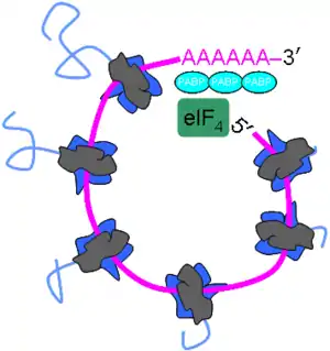 Two of the eIF4 proteins (of which there are several besides the IF4A helicase), eIF4E and eIF4G bind the mRNA cap to the PABP on the tail. This means that ribosomes form coiled structures on bound mRNA. Something similar also occurs in prokaryotes. These 'polyribosomes' increase the efficiency of translation, since less mRNA is needed (the ribosomes are only 80 nt apart, so many can simultaneously translate a single mRNA), and also allow efficient re-recruitment of terminated ribosomes back onto the RBS.