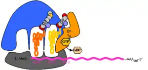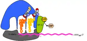 The second elongation factor, EF-G (EF-2), shunts the ribosome along, again using GTP.
