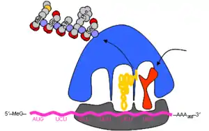 Peptide bond formation is performed by peptidyl transferase, whose active site contains an adenine ring from the 28S rRNA in large subunit. This performs and acid/base catalysis, just like histidine does in many enzymes. The antibiotic puromycin inhibits ribosomes by mimicking tRNAtyr and preventing the normal transfer of the nascent peptide chain from the tRNA in the P site transfers onto the tRNA in the A site.