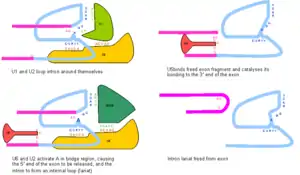 The U-particles combine with one another in a variety of ways to for spliceosomes. In the most typical splicing reaction, U1 binds the 5′ donor. U2 then binds the 3′ acceptor and bridge sequence. U4 and U6 act together to form a lariat, and then U5 ligates the exons together. Note that U2, U5 and U6 remain attached to the lariat in U-catalysed splicing. This helps mark the lariat for degradation.