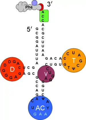 tRNAs are c. 80 bases long, and in eukaryotes, there are at least 31 in the cytoplasm, 30 in chloroplasts and 22 in mitochondria. All tRNAs have an acceptor stem with a 3′ CCA sequence, which (covalently) binds amino acids. They all also have a triplet anticodon, which (transiently) binds mRNA. The general structure is often termed a 'cloverleaf', which is true of the secondary structure, but somewhat misleading for the tertiary.