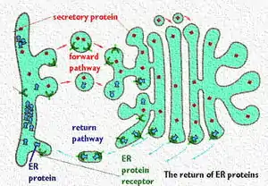 Sometimes vital proteins needed in the rough endoplasmic reticulum are transported along with the other proteins in the Golgi complex.[3] The Golgi complex has a mechanism for trapping them and sending them back to the rough endoplasmic reticulum.
