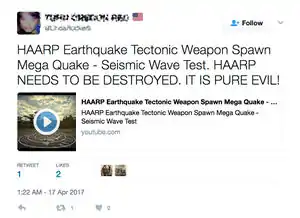 Apart from hard-core woo mongers and those committed to the NWO/Illuminati conspiracy narrative, there are a number of otherwise ordinary people who casually pass on bizarre memes about HAARP on the Internet and social media. It's hard to know if they do this to promote an edgy-cool persona, or to attract YouTube, Twitter and Facebook followers by posting (or reposting) sensational bullshit. There's a good chance a large percentage of this activity may stem from Russian troll farms masquerading as ordinary Americans to sow conspiracy theories on social media.[59]