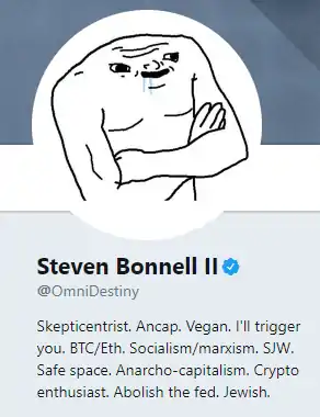 Gariépy: The second time is that I didn't want to refer to his name as Destiny because I didn't want to, I don't want to contribute to his popularity anymore, he's been defaming me on the public space, and so I said, "a Jewish Twitch star", because on his Twitter account, that's what he says. In his bio description, he says, um, anarcho-something, ancap, blah blah blah, and Jewish. And so that's how he self-identifies, so I have no problem in to labeling him a, a label that he is giving himself in his Twitter bio, just like I wouldn't have any problem saying "a biologist alt-righter", because I do write in my Twitter description that I am a biologist, and so people can call me a biologist, and I can call Destiny a Jew.[23]
