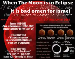 As the first two eclipses went by without any indications from The Big Guy In The Sky that they were significant, more and more were shoehorned into Hagee's Theory. Past Tetrads, for example, happened at the same time some significant event occurred in Israel. On this Tetrad, not only do Passover start on the exact same date as as the first and third eclipse, and the tabernacle on the second and third, but in between both will be a total solar eclipse, seen in Jerusalem. (This is important to the theory, especially since the first three weren't seen in Israel.)[23]
